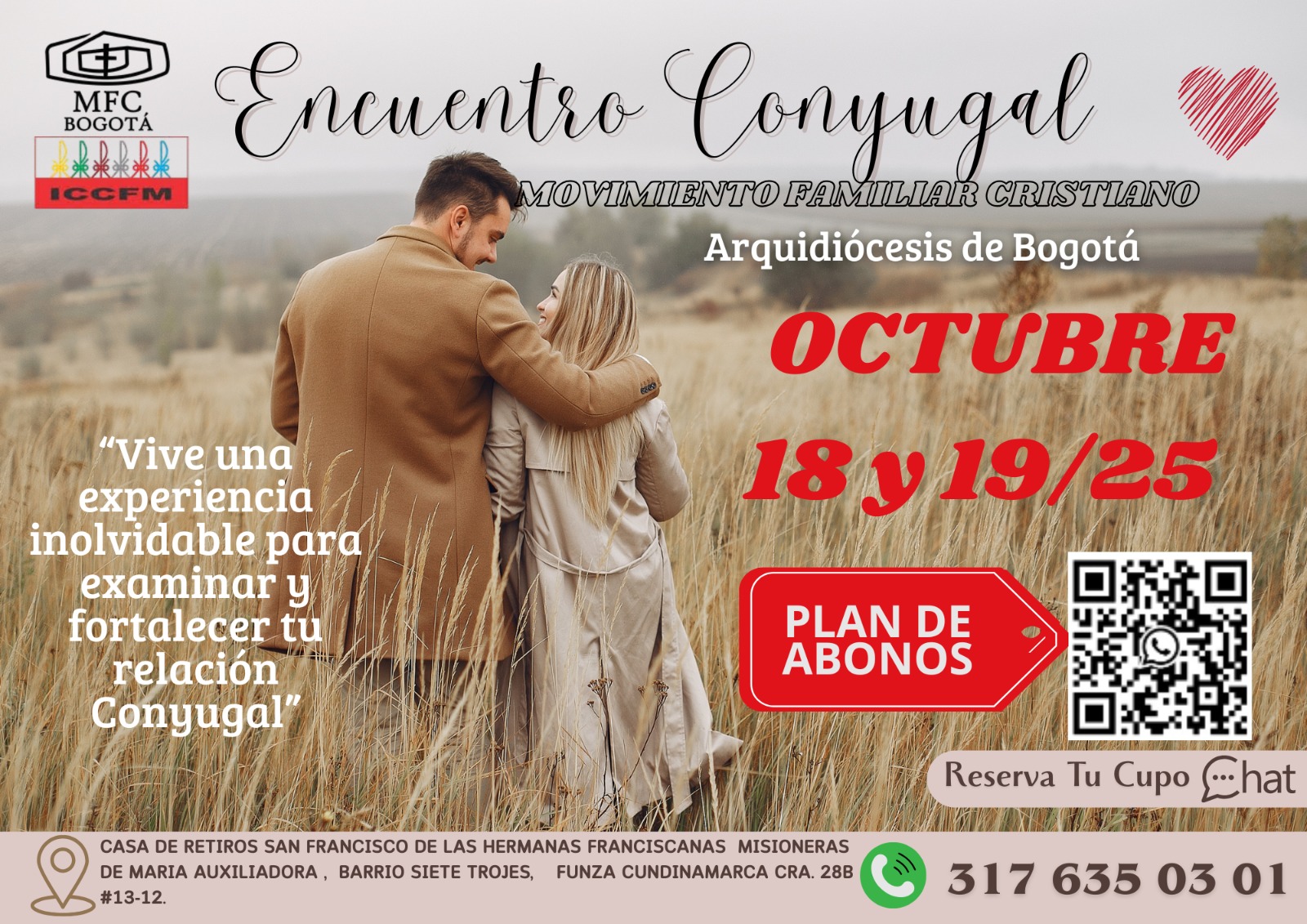 El Movimiento Familiar Cristiano, está conformado por un grupo de laicos, apoyados por la Arquidiócesis de Bogotá y bajo la orientación de un sacerdote, promueve los valores humanos y cristianos, para que la familia sea formadora de personas, educadora en la fe y defensora de la vida.