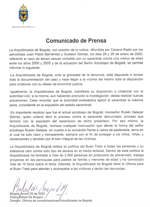 Centro de información Yo quiero Noticias Boletines Eventos Artículos Canonización Mensajes del Señor Cardenal Cartas pastorales Homilías Mensajes La voz del pastor Documentos del Vaticano NoticiasComunicado de prensa29 de Enero de 2020 Like 0 Dislike 0 Noticias relacionadas Mensaje de Mons. Edwin Vanegas Cuervo, obispo auxiliar de Bogotá La Santa Misa en Semana Santa La Arquidiócesis de Bogotá celebra el nombramiento de Monseñor Paolo Rudelli en la Santa Sede