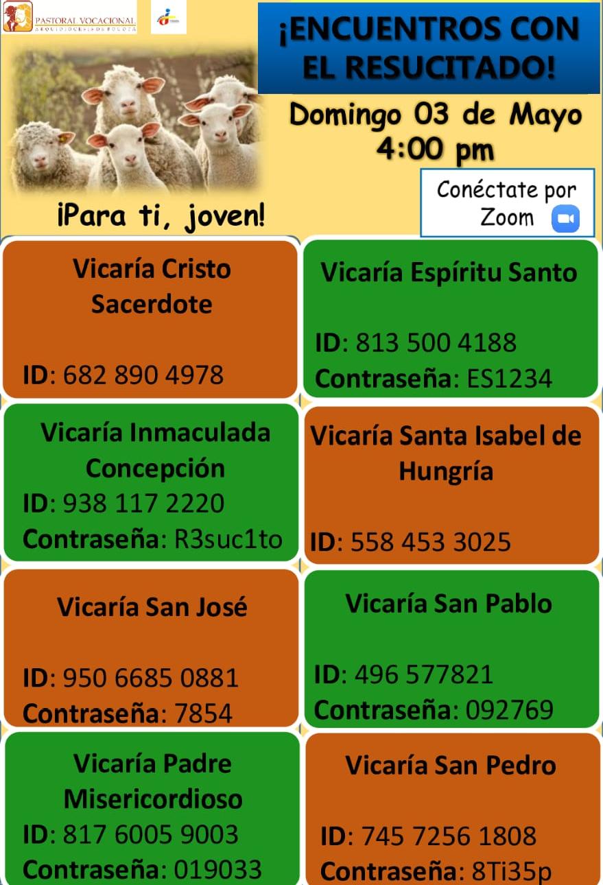 5. Tengamos en cuenta que durante estos domingos del tiempo pascual, en una propuesta articulada con Puente J, estamos viviendo un espacio de oración con jóvenes y para jóvenes, denominado Encuentros con el Resucitado, a través de la plataforma zoom a las 4:00 pm, desde las distintas vicarias episcopales territoriales. También va la tarjeta de divulgación anexa por este medio, para involucrar a jóvenes de nuestros ambientes evangelizadores. En algunos encuentros se han vinculado y participado algunos sacerdotes, lo cual ha sido bastante valorado por los participantes.
