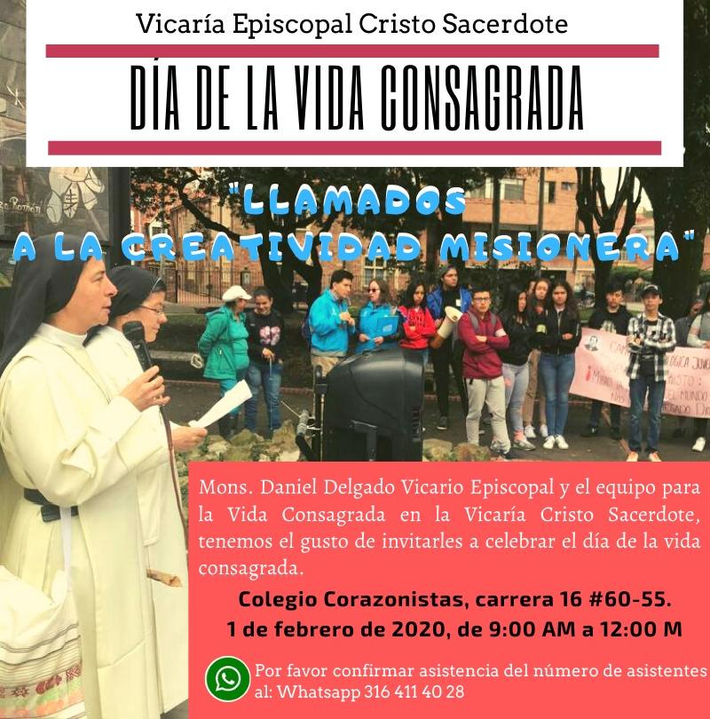 Centro de información Yo quiero Noticias Boletines Eventos Artículos Canonización Mensajes del Señor Cardenal Cartas pastorales Homilías Mensajes La voz del pastor Documentos del Vaticano NoticiasJornada Mundial de la Vida Consagrada31 de Enero de 2020La arquidiócesis de Bogotá, a través de las vicarías episcopales territoriales se une a la conmemoración de la Jornada Mundial de la Vida Consagrada que se celebrará el… Like 0 Dislike 0 Noticias relacionadas Mensaje de Mons. Edwin Vanegas Cuervo, obispo auxiliar de Bogotá La Santa Misa en Semana Santa La Arquidiócesis de Bogotá celebra el nombramiento de Monseñor Paolo Rudelli en la Santa Sede