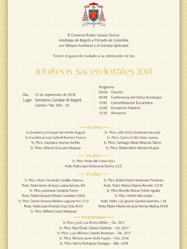 Centro de información Yo quiero Noticias Boletines Eventos Artículos Canonización Mensajes del Cardenal Cartas pastorales Homilías Mensajes La voz del pastor Documentos del Vaticano NoticiasJubileos Sacerdotales 201825 de Septiembre de 2018 Like 0 Dislike 0 Noticias relacionadas Alerta a la comunidad: circulación de videos falsos del cardenal Luis José Rueda Aparicio ✅ Dona en tu parroquia Mensaje de Mons. Edwin Vanegas Cuervo, obispo auxiliar de Bogotá