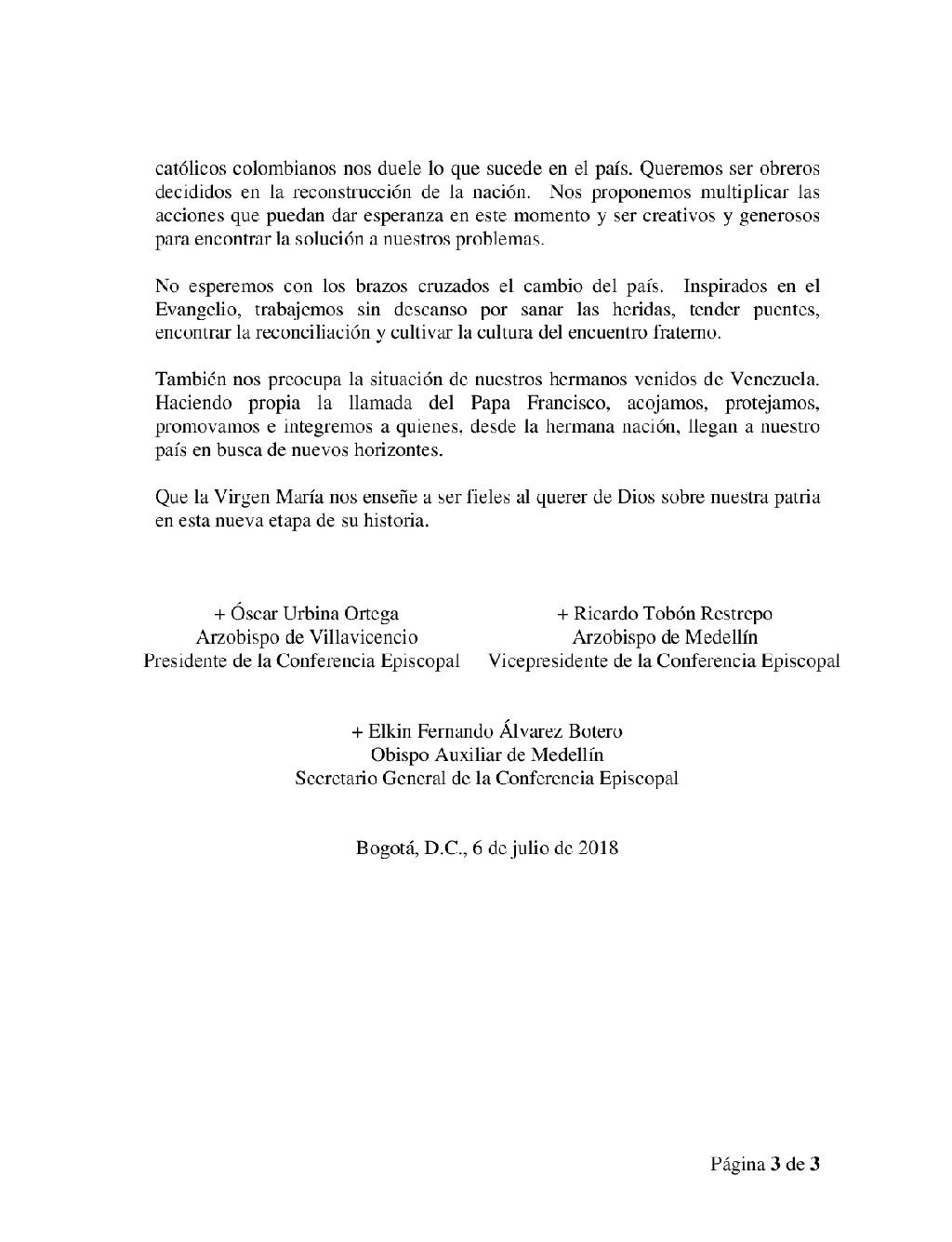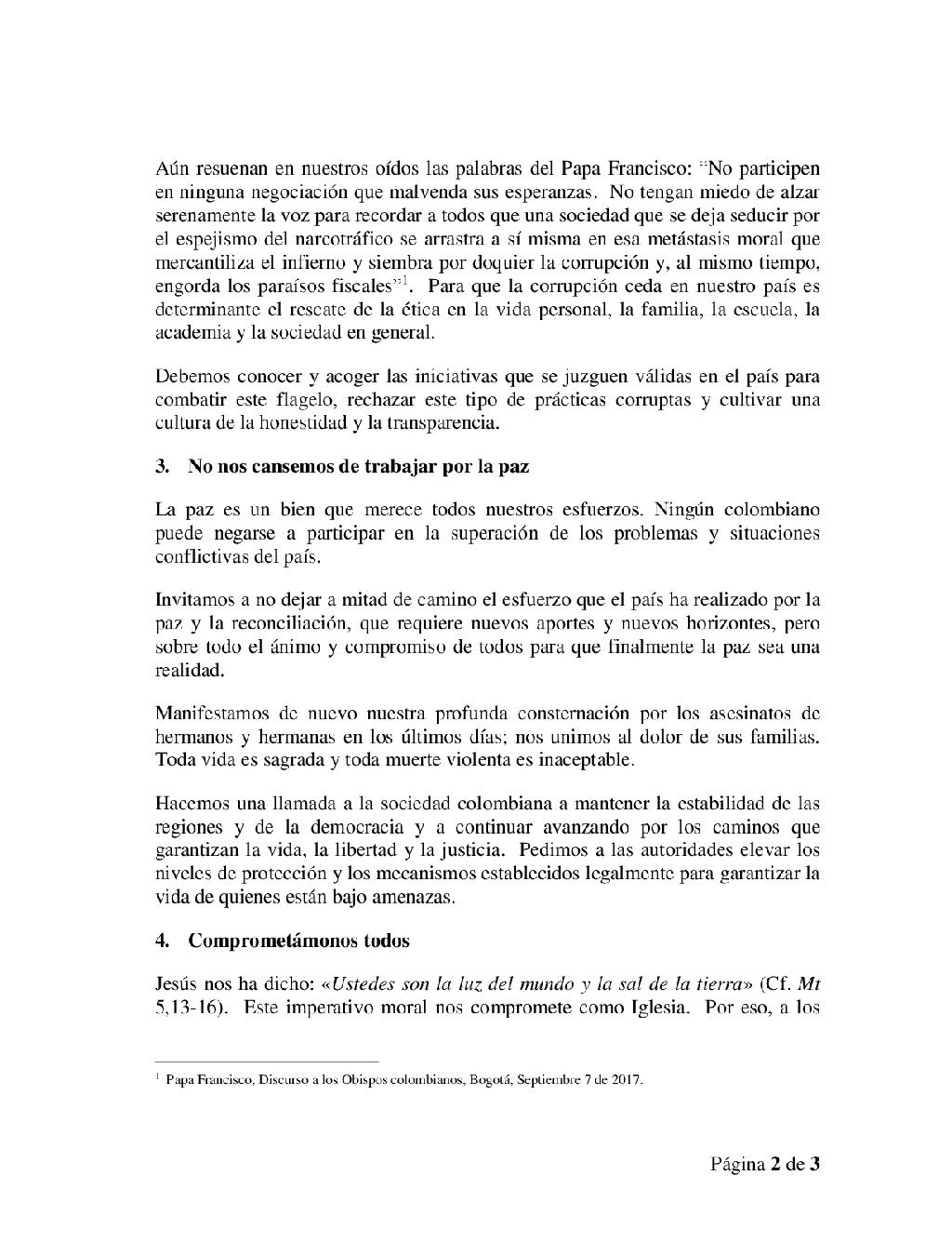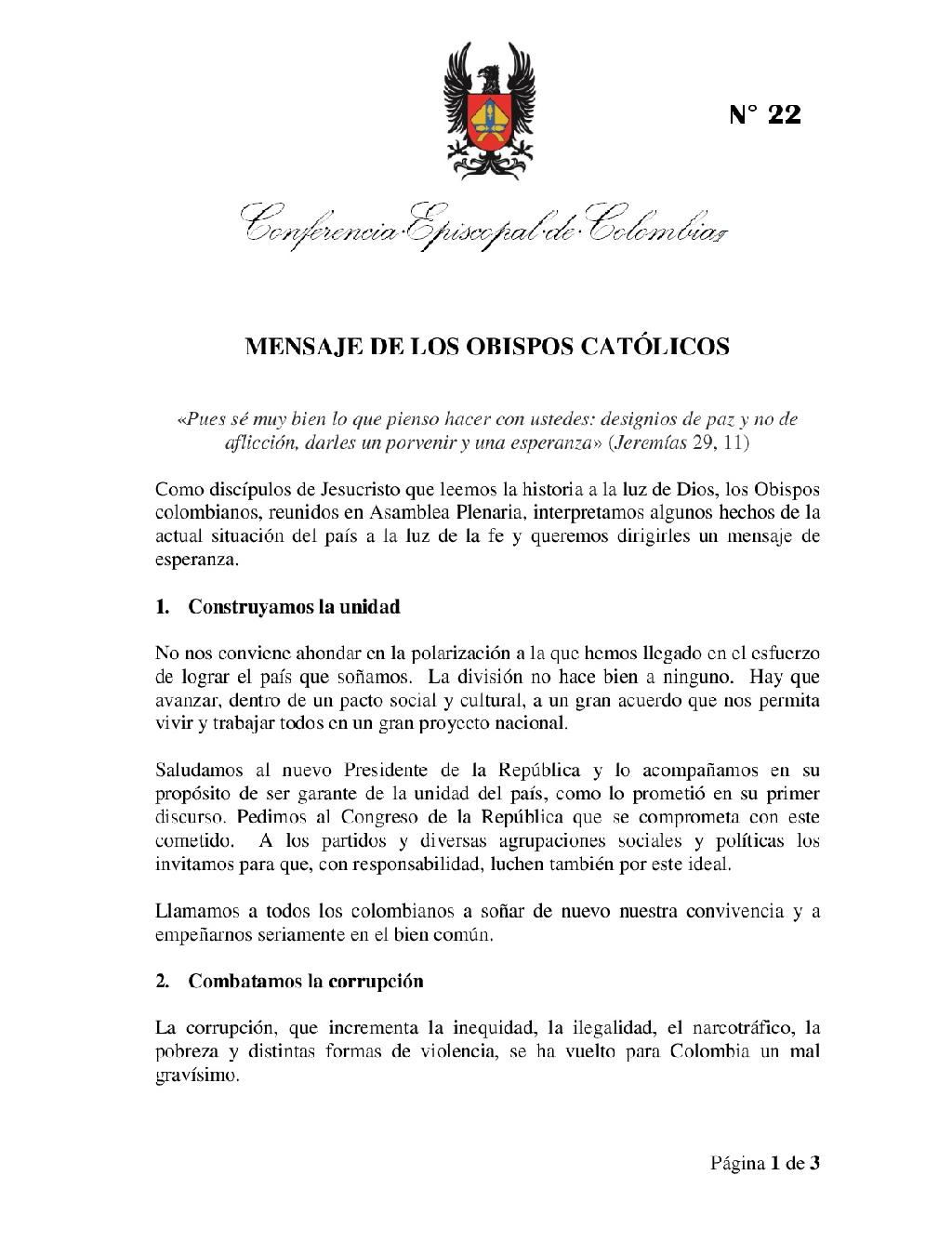 Centro de información Yo quiero Noticias Boletines Eventos Artículos Canonización Mensajes del Cardenal Cartas pastorales Homilías Mensajes La voz del pastor Documentos del Vaticano NoticiasObispos invitan a construir unidad, combatir la corrupción y trabajar por la paz6 de Julio de 2018Tras concluir la CVI Asamblea Plenaria del Episcopado Colombiano, a través de un mensaje, los obispos del país invitaron a las nuevas autoridades y a todos los… Like 0 Dislike 0 Noticias relacionadas Alerta a la comunidad: circulación de videos falsos del cardenal Luis José Rueda Aparicio ✅ Dona en tu parroquia Mensaje de Mons. Edwin Vanegas Cuervo, obispo auxiliar de Bogotá