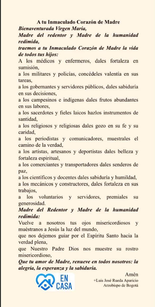 Centro de información Yo quiero Noticias Boletines Eventos Artículos Canonización Mensajes del Señor Cardenal Cartas pastorales Homilías Mensajes La voz del pastor Documentos del Vaticano NoticiasOración a María27 de Julio de 2020 Like 0 Dislike 0 Noticias relacionadas Mensaje de Mons. Edwin Vanegas Cuervo, obispo auxiliar de Bogotá La Santa Misa en Semana Santa La Arquidiócesis de Bogotá celebra el nombramiento de Monseñor Paolo Rudelli en la Santa Sede