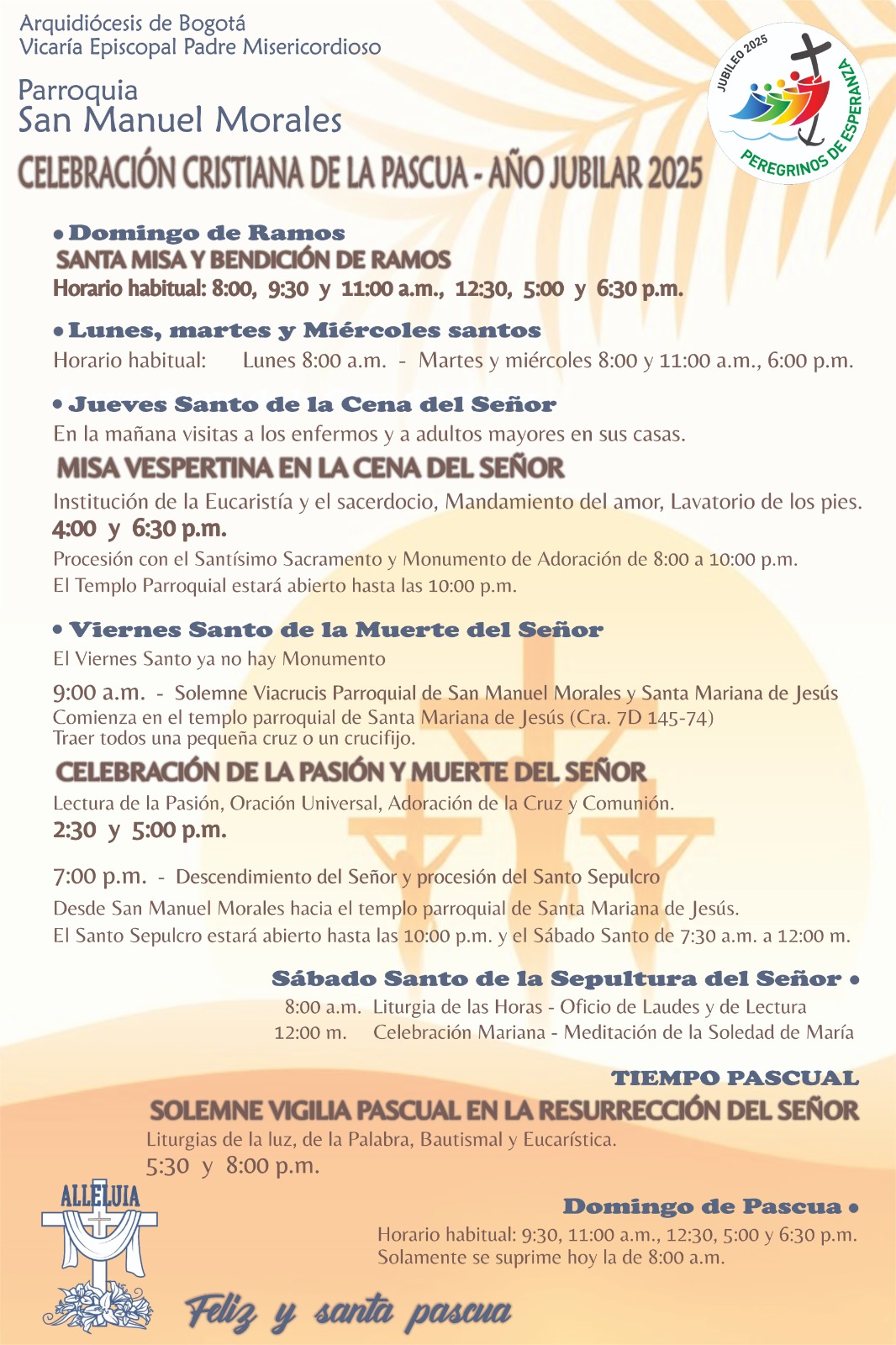NoticiasProgramación de Semana Santa 202530 de Marzo de 2025Conoce nuestra Programacion en esta Semana Santa 2025 Los invitamos a participar en las celebraciones de Semana Santa en nuestra Parroquia, en este año Jubilar. Like 1 Dislike 0