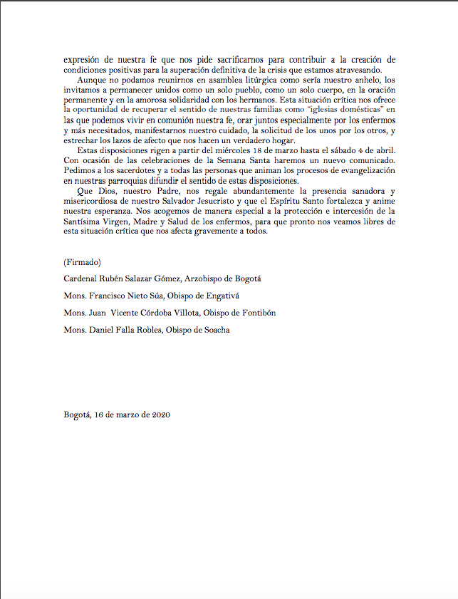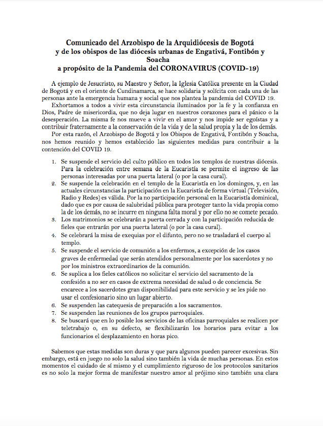 Centro de información Yo quiero Noticias Boletines Eventos Artículos Canonización Mensajes del Señor Cardenal Cartas pastorales Homilías Mensajes La voz del pastor Documentos del Vaticano NoticiasSe suspende el servicio del culto público en todos los templos de Bogotá16 de Marzo de 2020Los obispos de las diócesis del territorio metropolitano de Bogotá (Engativá, Soacha y Fontibón) han dado a conocer un comunicado sobre la suspensión del culto público… Like 0 Dislike 0 Noticias relacionadas Mensaje de Mons. Edwin Vanegas Cuervo, obispo auxiliar de Bogotá La Santa Misa en Semana Santa La Arquidiócesis de Bogotá celebra el nombramiento de Monseñor Paolo Rudelli en la Santa Sede