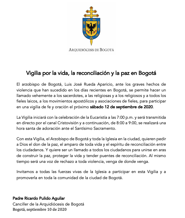 Centro de información Yo quiero Noticias Boletines Eventos Artículos Canonización Mensajes del Señor Cardenal Cartas pastorales Homilías Mensajes La voz del pastor Documentos del Vaticano NoticiasVigilia por la vida, la reconciliación y la paz en Bogotá12 de Septiembre de 2020 Like 0 Dislike 0 Noticias relacionadas ‼️🚨Denunciemos 📣 ✅