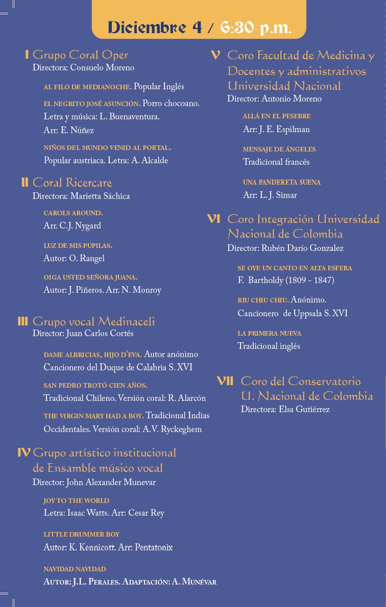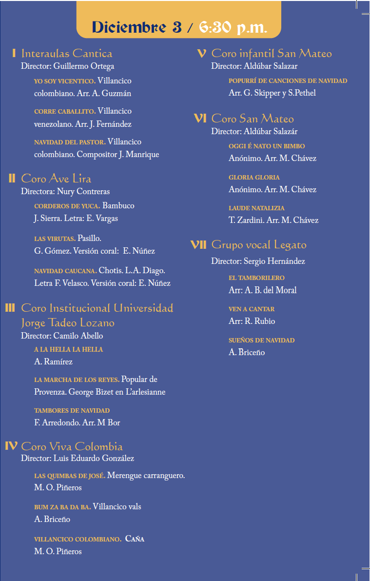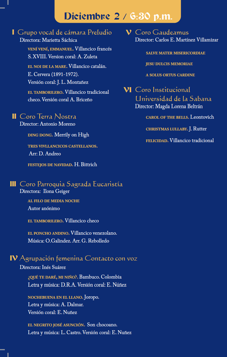 Centro de información Yo quiero Noticias Boletines Eventos Artículos Canonización Mensajes del Señor Cardenal Cartas pastorales Homilías Mensajes La voz del pastor Documentos del Vaticano NoticiasXXI Festival de Villancicos, Capilla Cristo Maestro 20142 de Diciembre de 2014 Like 0 Dislike 0 Noticias relacionadas #Destacado Proyecto educativo del SEAB #Recomendado